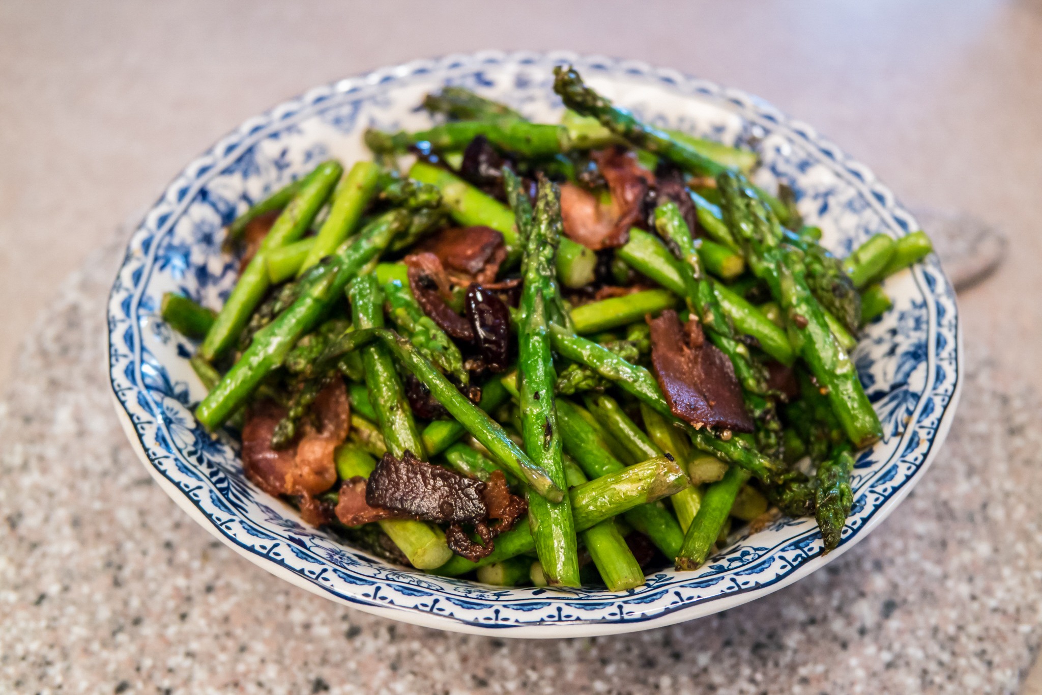 Now take it to the grill. I use a perforated grilling basket, with the propane burners on high. Cook the asparagus mix, turning it frequently with a spatula, until the asparagus is almost tender enough to eat; then add the crisped bacon and continue grilling until the asparagus reaches the desired tenderness. Some people like it a little crunchy, while others prefer it almost soft.